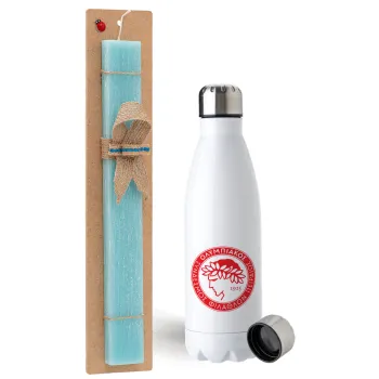 Ολυμπιακός, Easter Set, metallic stainless steel water bottle (750ml) & aromatic flat Easter candle (30cm) (TURQUOISE)