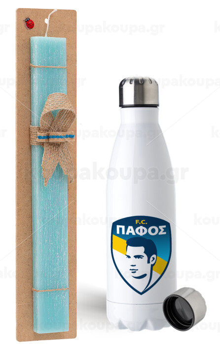 Πάφος FC, Easter Set, metallic stainless steel water bottle (750ml) & aromatic flat Easter candle (30cm) (TURQUOISE)