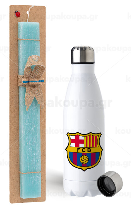 Barcelona FC, Easter Set, metallic stainless steel water bottle (750ml) & aromatic flat Easter candle (30cm) (TURQUOISE)