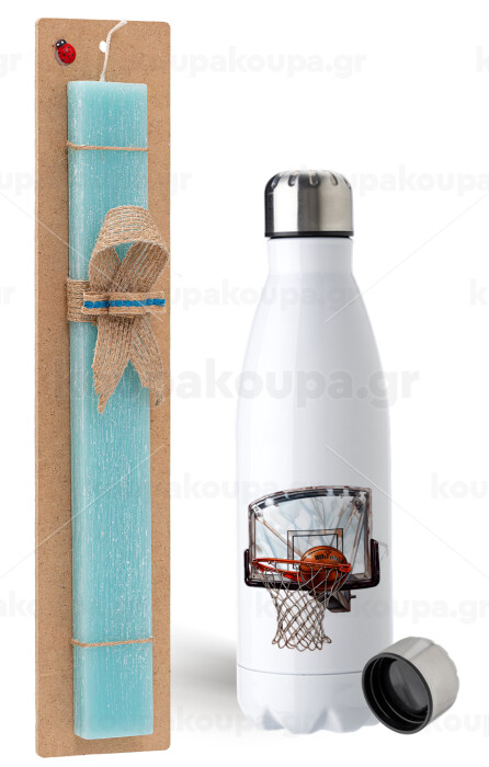 Basketball, Easter Set, metallic stainless steel water bottle (750ml) & aromatic flat Easter candle (30cm) (TURQUOISE)