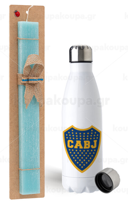 Club Atlético Boca Juniors, Easter Set, metallic stainless steel water bottle (750ml) & aromatic flat Easter candle (30cm) (TURQUOISE)