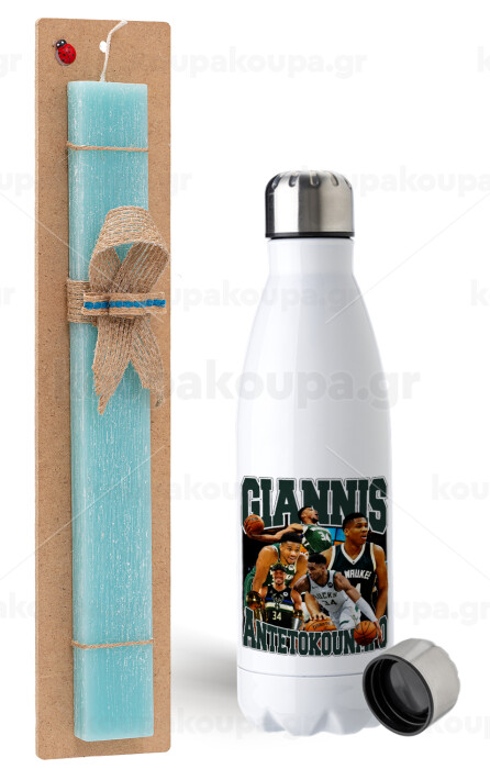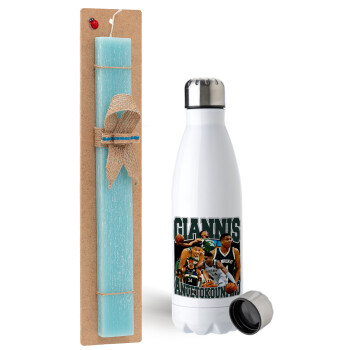 Giannis Antetokounmpo, Easter Set, metallic stainless steel water bottle (750ml) & aromatic flat Easter candle (30cm) (TURQUOISE)