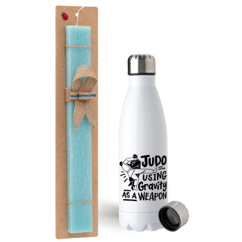 Judo using gravity as a weapon, Easter Set, metallic stainless steel water bottle (750ml) & aromatic flat Easter candle (30cm) (TURQUOISE)