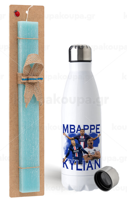 Kylian Mbappé, Easter Set, metallic stainless steel water bottle (750ml) & aromatic flat Easter candle (30cm) (TURQUOISE)