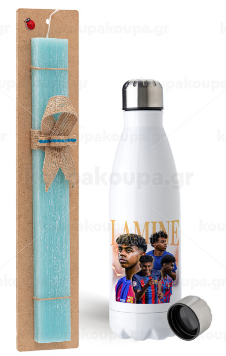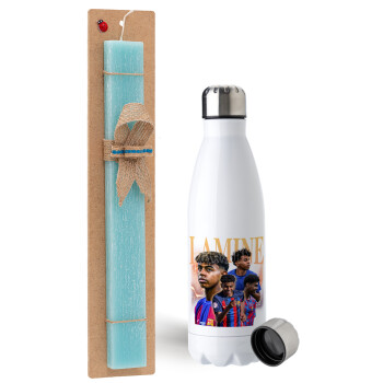 lamine yamal FCB, Easter Set, metallic stainless steel water bottle (750ml) & aromatic flat Easter candle (30cm) (TURQUOISE)