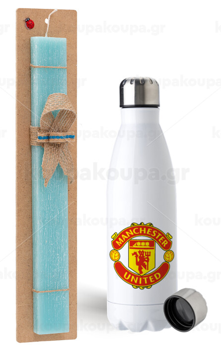 Manchester United F.C., Easter Set, metallic stainless steel water bottle (750ml) & aromatic flat Easter candle (30cm) (TURQUOISE)