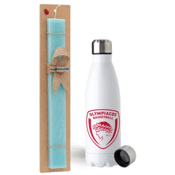 Olympiacos B.C., Easter Set, metallic stainless steel water bottle (750ml) & aromatic flat Easter candle (30cm) (TURQUOISE)