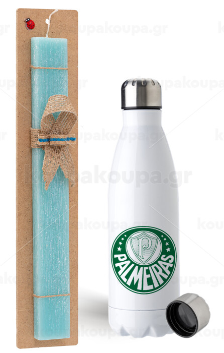 Palmeiras, Easter Set, metallic stainless steel water bottle (750ml) & aromatic flat Easter candle (30cm) (TURQUOISE)