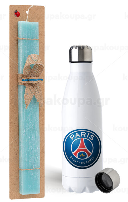 Paris Saint-Germain F.C., Easter Set, metallic stainless steel water bottle (750ml) & aromatic flat Easter candle (30cm) (TURQUOISE)