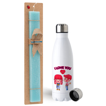 Couple, I love you, Easter Set, metallic stainless steel water bottle (750ml) & aromatic flat Easter candle (30cm) (TURQUOISE)