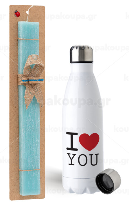 I Love you classic, Easter Set, metallic stainless steel water bottle (750ml) & aromatic flat Easter candle (30cm) (TURQUOISE)