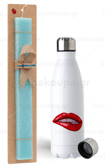 Lips, Easter Set, metallic stainless steel water bottle (750ml) & aromatic flat Easter candle (30cm) (TURQUOISE)