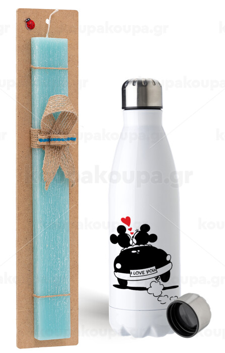 Love Car, Easter Set, metallic stainless steel water bottle (750ml) & aromatic flat Easter candle (30cm) (TURQUOISE)