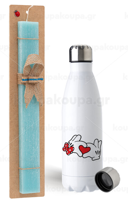 Love hands, Easter Set, metallic stainless steel water bottle (750ml) & aromatic flat Easter candle (30cm) (TURQUOISE)