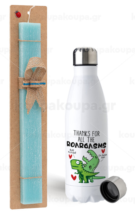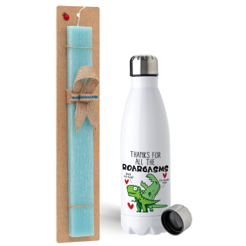 Thanks for all the ROARGASMS, Easter Set, metallic stainless steel water bottle (750ml) & aromatic flat Easter candle (30cm) (TURQUOISE)