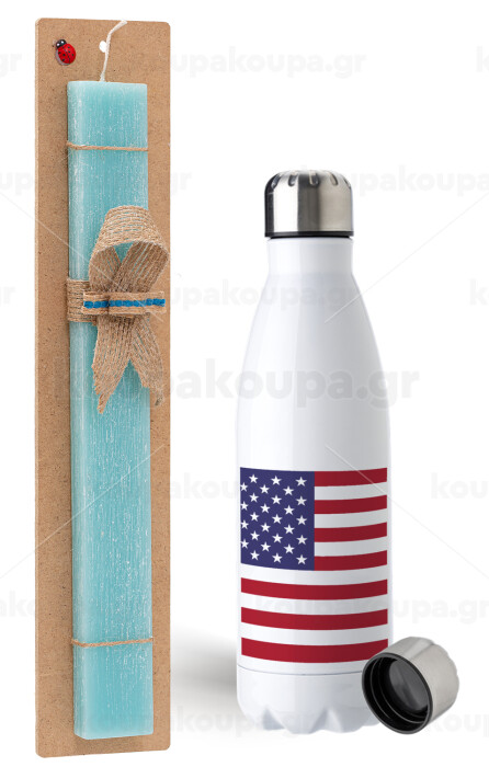 USA Flag, Easter Set, metallic stainless steel water bottle (750ml) & aromatic flat Easter candle (30cm) (TURQUOISE)
