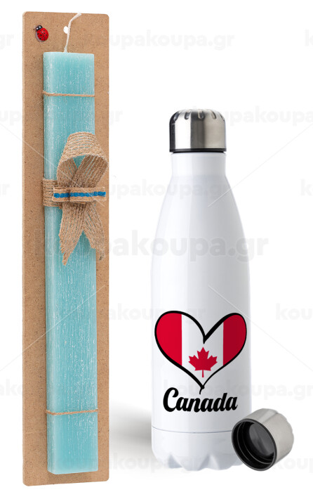 Canada flag, Easter Set, metallic stainless steel water bottle (750ml) & aromatic flat Easter candle (30cm) (TURQUOISE)