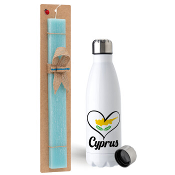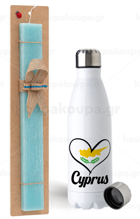 Cyprus flag, Easter Set, metallic stainless steel water bottle (750ml) & aromatic flat Easter candle (30cm) (TURQUOISE)