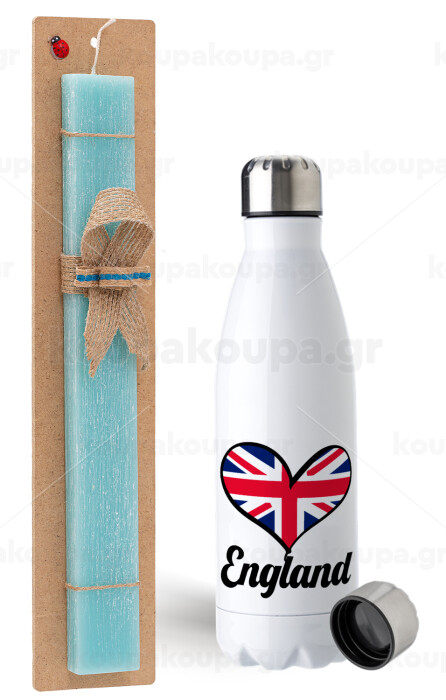 England flag, Easter Set, metallic stainless steel water bottle (750ml) & aromatic flat Easter candle (30cm) (TURQUOISE)