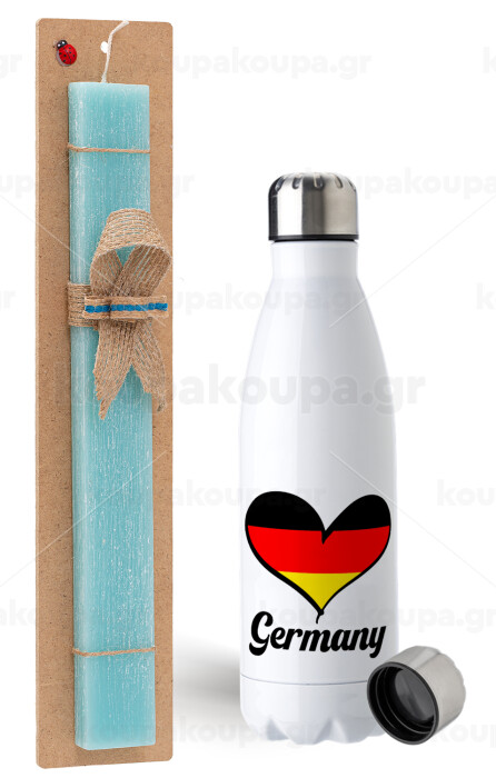 Germany flag, Easter Set, metallic stainless steel water bottle (750ml) & aromatic flat Easter candle (30cm) (TURQUOISE)
