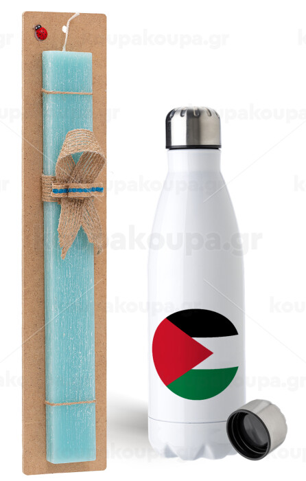 Palestine Flag, Easter Set, metallic stainless steel water bottle (750ml) & aromatic flat Easter candle (30cm) (TURQUOISE)