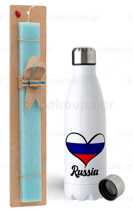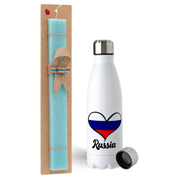Russia flag, Easter Set, metallic stainless steel water bottle (750ml) & aromatic flat Easter candle (30cm) (TURQUOISE)