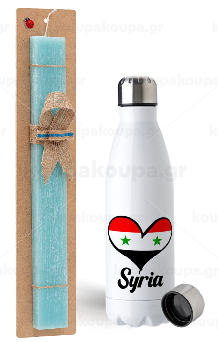 Syria flag, Easter Set, metallic stainless steel water bottle (750ml) & aromatic flat Easter candle (30cm) (TURQUOISE)