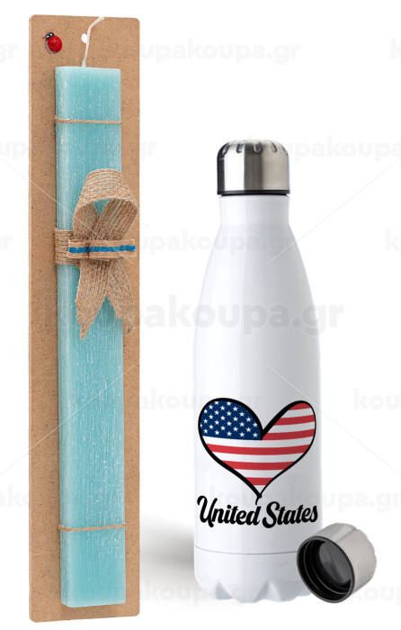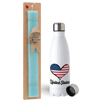 USA flag, Easter Set, metallic stainless steel water bottle (750ml) & aromatic flat Easter candle (30cm) (TURQUOISE)