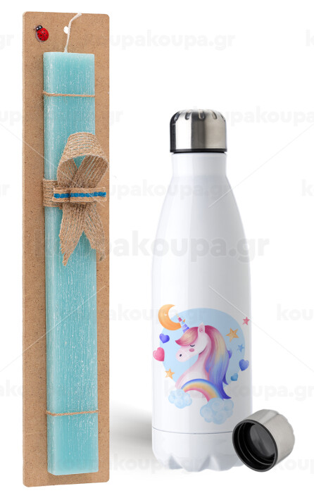 Cute unicorn, Easter Set, metallic stainless steel water bottle (750ml) & aromatic flat Easter candle (30cm) (TURQUOISE)