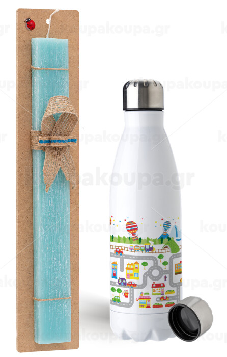 City road track maps, Easter Set, metallic stainless steel water bottle (750ml) & aromatic flat Easter candle (30cm) (TURQUOISE)