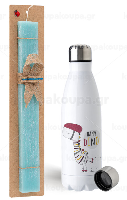 Happy Dino, Easter Set, metallic stainless steel water bottle (750ml) & aromatic flat Easter candle (30cm) (TURQUOISE)
