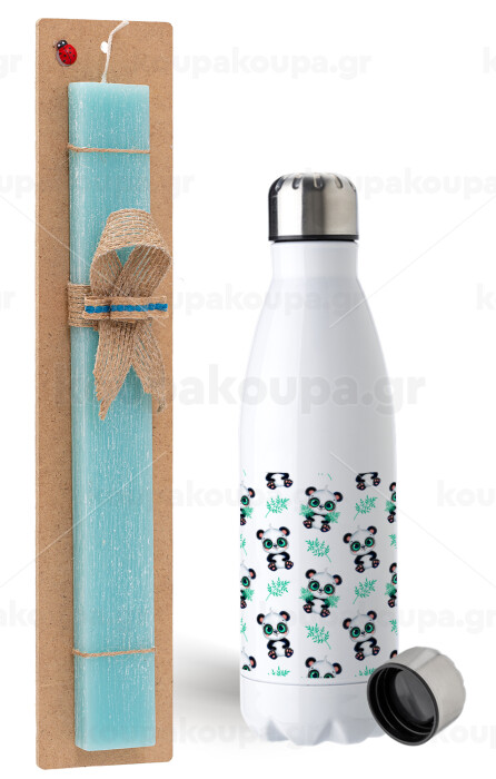 Panda, Easter Set, metallic stainless steel water bottle (750ml) & aromatic flat Easter candle (30cm) (TURQUOISE)