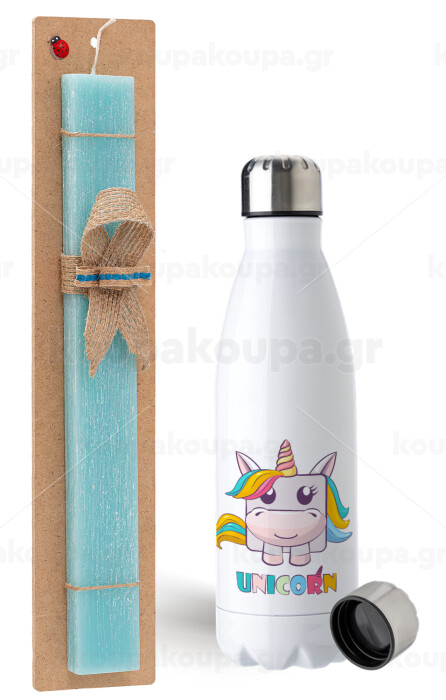 Unicorns cube, Easter Set, metallic stainless steel water bottle (750ml) & aromatic flat Easter candle (30cm) (TURQUOISE)