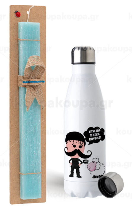Κρητικός "Έρχεται Πάσχα κουράδι", Easter Set, metallic stainless steel water bottle (750ml) & aromatic flat Easter candle (30cm) (TURQUOISE)