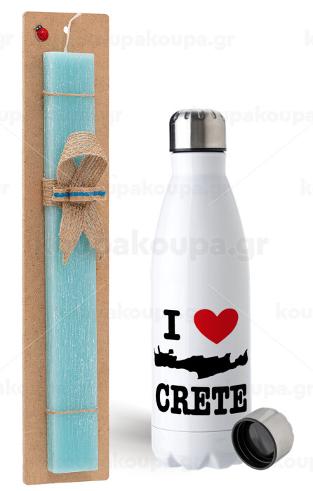 I Love Crete, Easter Set, metallic stainless steel water bottle (750ml) & aromatic flat Easter candle (30cm) (TURQUOISE)