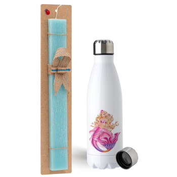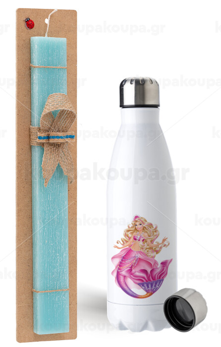 Barbie mermaid , Easter Set, metallic stainless steel water bottle (750ml) & aromatic flat Easter candle (30cm) (TURQUOISE)