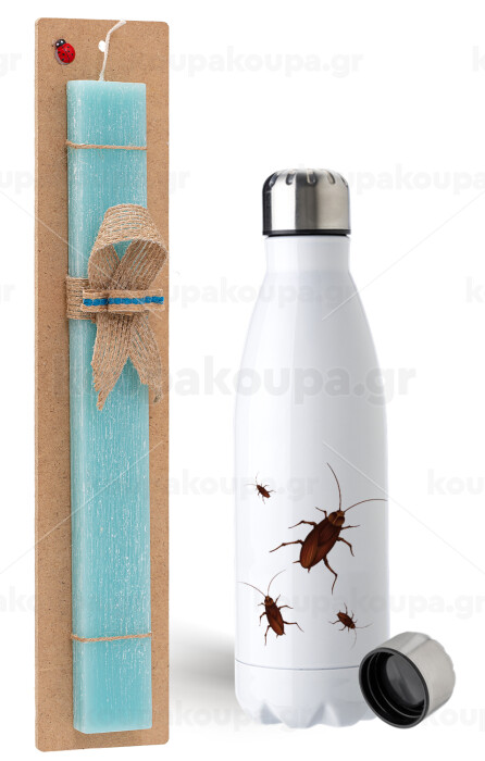 Blattodea, Easter Set, metallic stainless steel water bottle (750ml) & aromatic flat Easter candle (30cm) (TURQUOISE)