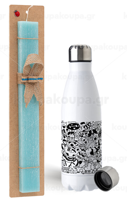 DOG pattern, Easter Set, metallic stainless steel water bottle (750ml) & aromatic flat Easter candle (30cm) (TURQUOISE)