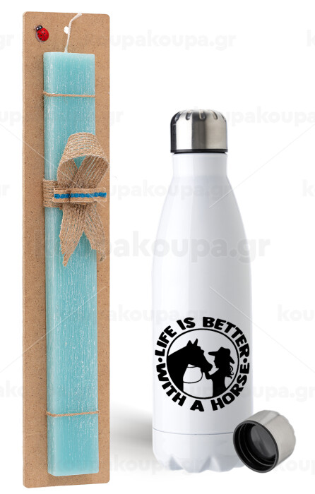 Life is Better with a Horse, Easter Set, metallic stainless steel water bottle (750ml) & aromatic flat Easter candle (30cm) (TURQUOISE)