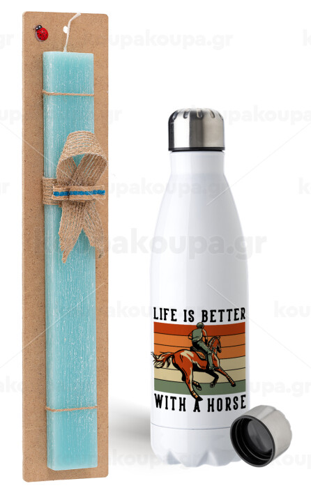 Life is Better with a Horse, Easter Set, metallic stainless steel water bottle (750ml) & aromatic flat Easter candle (30cm) (TURQUOISE)