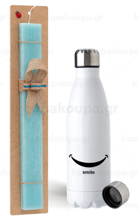 Smile!!!, Easter Set, metallic stainless steel water bottle (750ml) & aromatic flat Easter candle (30cm) (TURQUOISE)