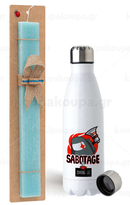 Among US Sabotage, Easter Set, metallic stainless steel water bottle (750ml) & aromatic flat Easter candle (30cm) (TURQUOISE)