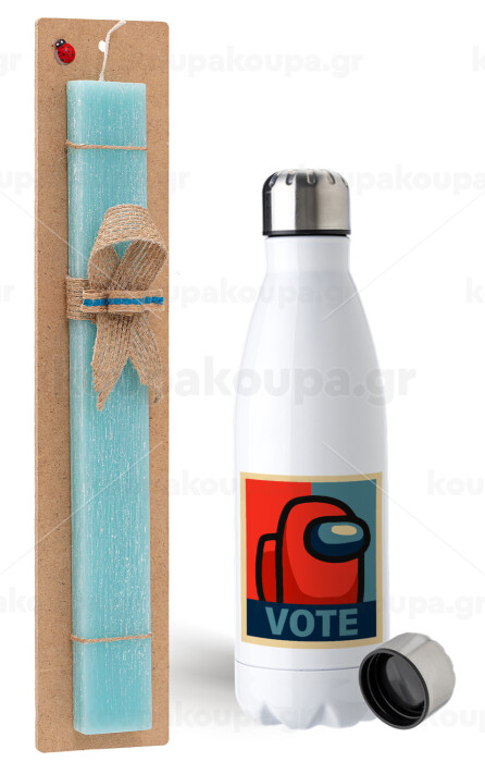 Among US VOTE, Easter Set, metallic stainless steel water bottle (750ml) & aromatic flat Easter candle (30cm) (TURQUOISE)