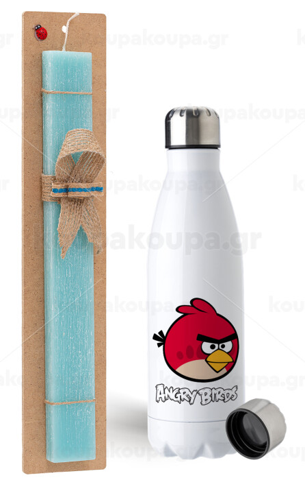 Angry birds Terence, Easter Set, metallic stainless steel water bottle (750ml) & aromatic flat Easter candle (30cm) (TURQUOISE)