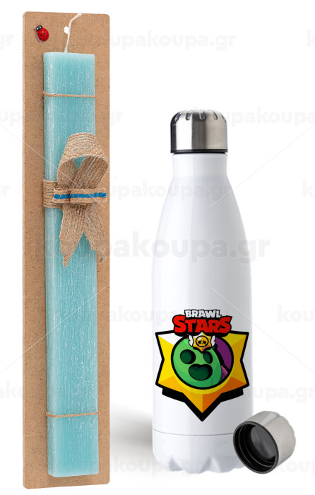 Brawl Stars Spike, Easter Set, metallic stainless steel water bottle (750ml) & aromatic flat Easter candle (30cm) (TURQUOISE)