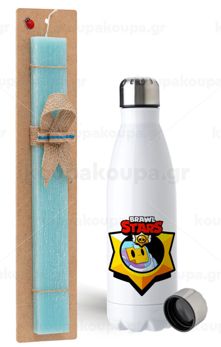 Brawl Stars Sprout, Easter Set, metallic stainless steel water bottle (750ml) & aromatic flat Easter candle (30cm) (TURQUOISE)