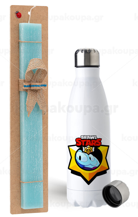 Brawl Stars Squeak, Easter Set, metallic stainless steel water bottle (750ml) & aromatic flat Easter candle (30cm) (TURQUOISE)