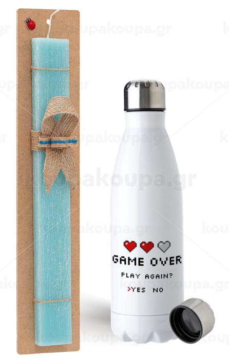 GAME OVER, Play again? YES - NO, Easter Set, metallic stainless steel water bottle (750ml) & aromatic flat Easter candle (30cm) (TURQUOISE)