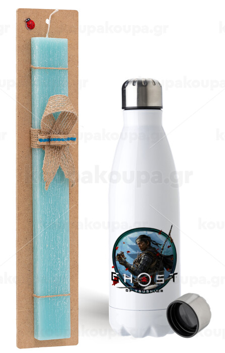 Ghost of Tsushima, Easter Set, metallic stainless steel water bottle (750ml) & aromatic flat Easter candle (30cm) (TURQUOISE)
