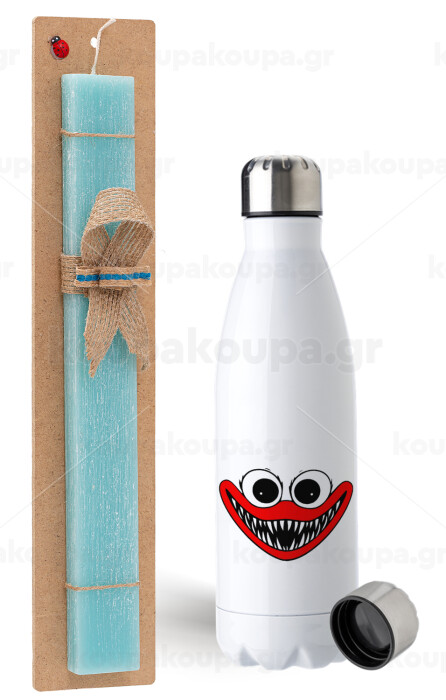 Huggy wuggy, Easter Set, metallic stainless steel water bottle (750ml) & aromatic flat Easter candle (30cm) (TURQUOISE)
